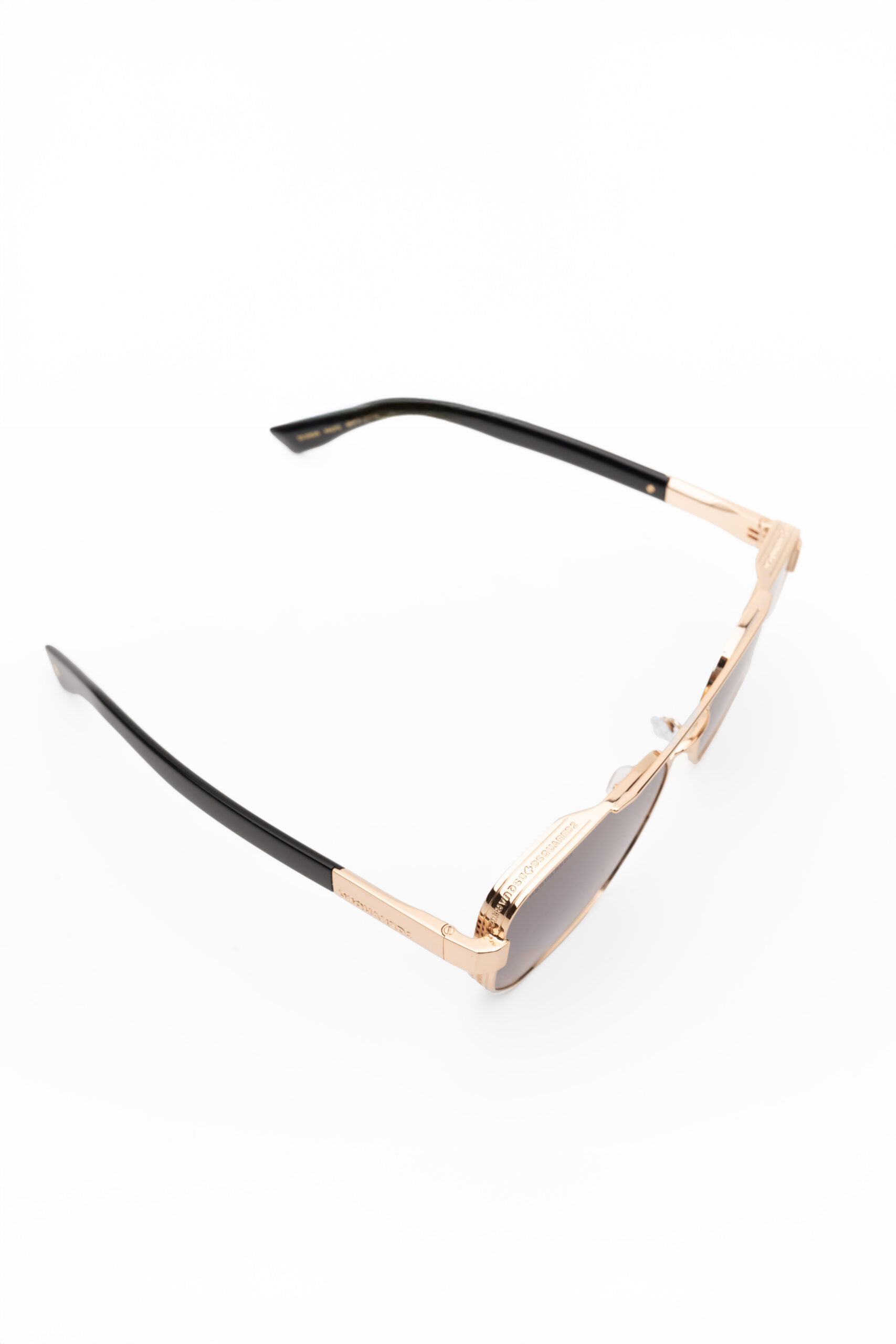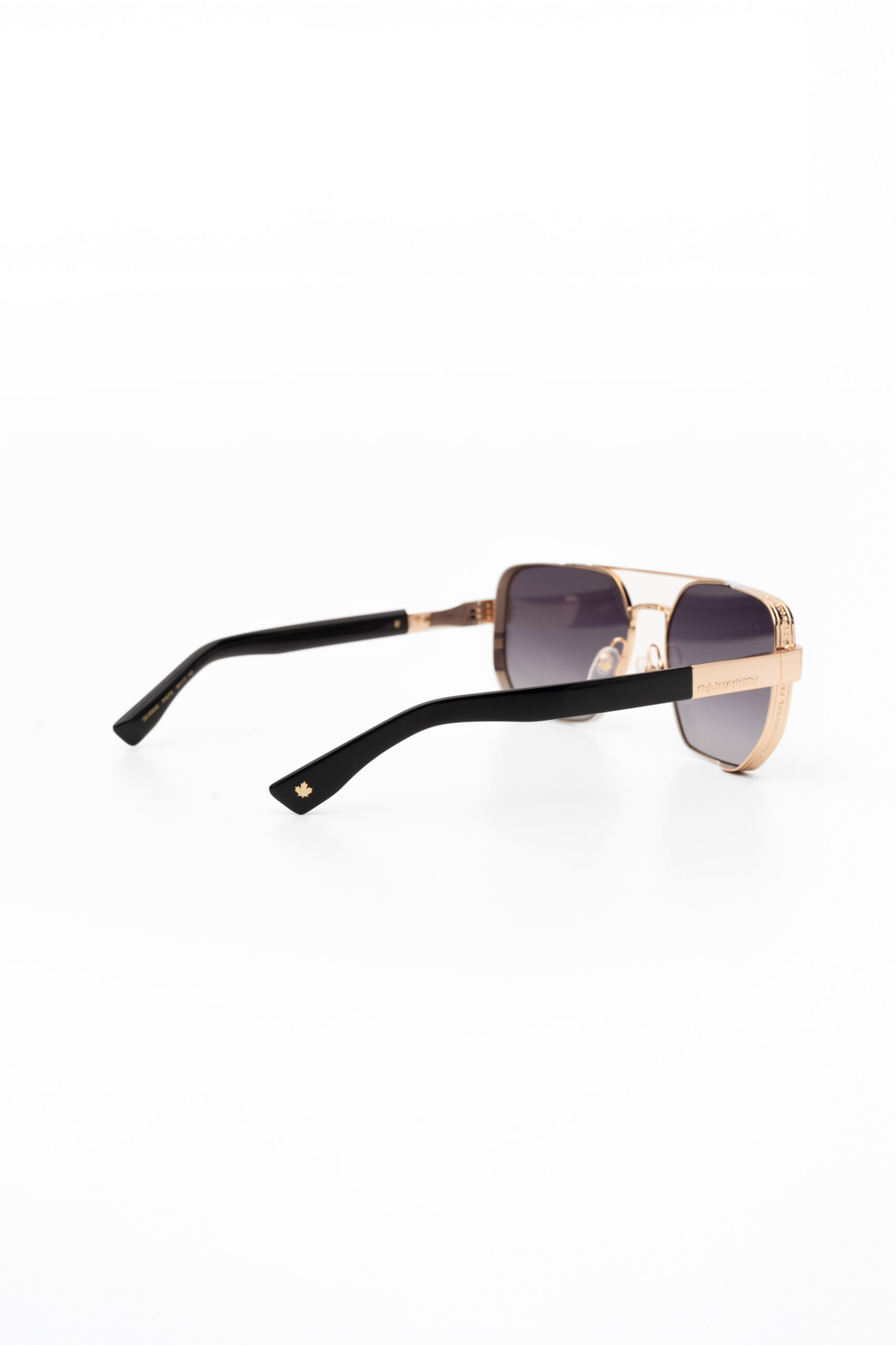These men’s DSQUARED2 sunglasses feature a striking geometric front paired with a sleek double metal bridge and adjustable nose pads adorned with the iconic maple leaf. A unique spoiler detail is wrapped in a sculpted band showcasing the brand’s name in a repeating pattern. The metal temples are accented with an off-center, raised DSQUARED2 logo, while the inner right temple bears the CERESIO 9, MILANO inscription. Finishing the look, the signature maple leaf decorates the elongated temple tips for a distinctive touch.